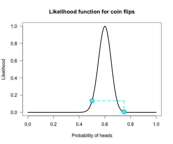 I continue to sample, and end up with this set of observations: {W, W, W, W, W, W}. Each white ball that I draw counts as evidence of 2 for basket B over basket A, so my evidence looks like this: {2, 2, 2, 2, 2, 2}. Multiply them all together and my total evidence for B over A is 2^6, or 64. This interpretation is simple: The total accumulated data are, all together, 64 times more probable under basket B than basket A. This number represents a simple Bayes factor, or likelihood ratio.