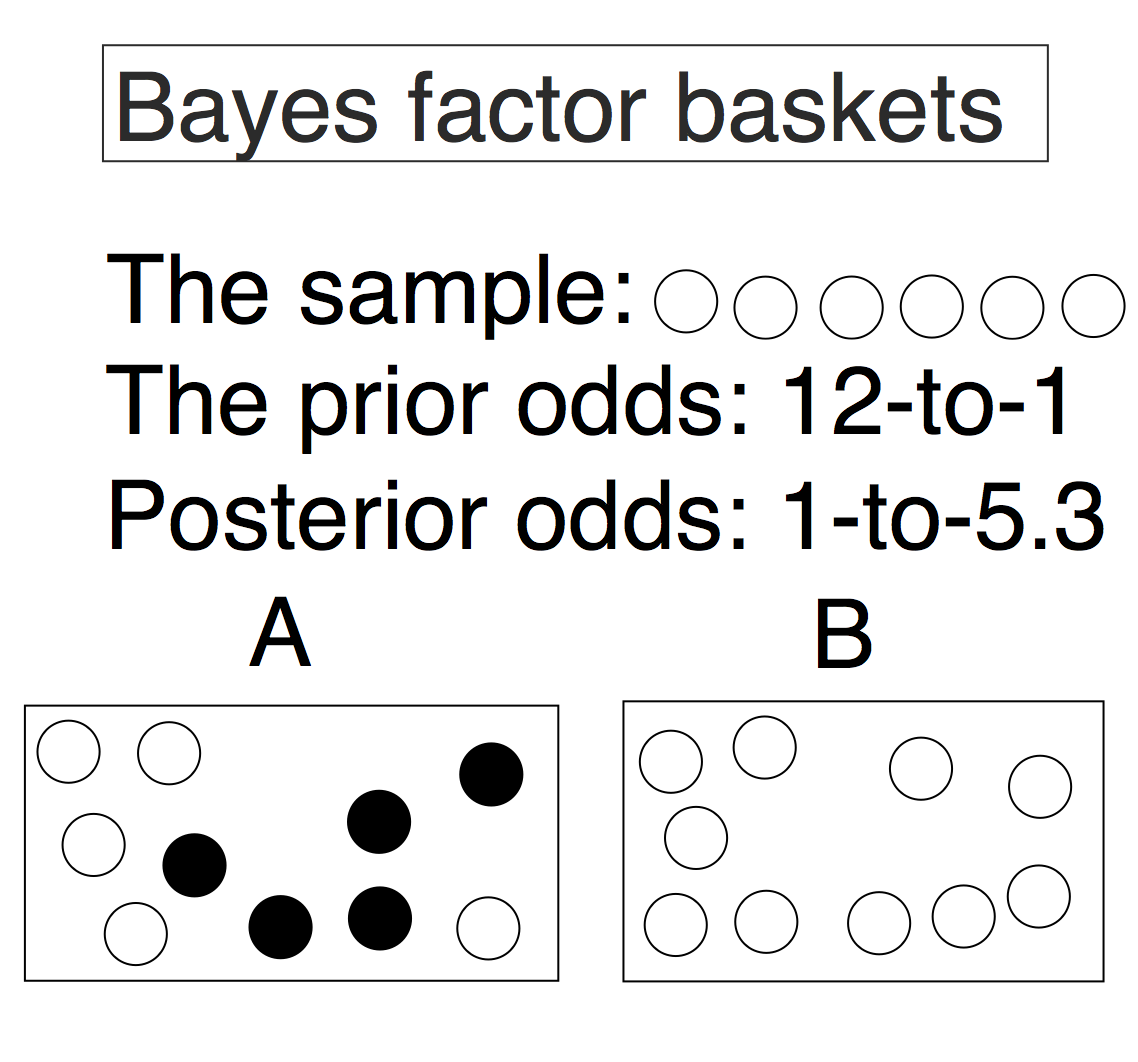 In the example just given, the posterior odds happen to equal the Bayes factor. Since the prior odds were 1-to-1, we multiply by the Bayes factor of 1-to-64, to obtain posterior odds of 1-to-64 favoring basket B. This means that, when these are the only two possible baskets, the probability of basket A has shrunk from 50% to 2% and the probability of basket B has grown from 50% to 98%. (To convert odds to probabilities divide the odds by odds+1.) This is the conclusion, and it necessarily depends on the prior odds we assign.